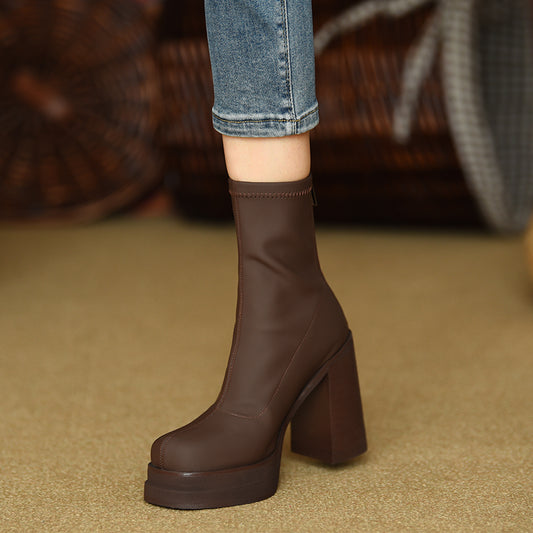 Elastic Slim Boots Thick Heel Short Boots Women's New High Heel Shoes Autumn Winter Thick Sole Square Head Women's Boots