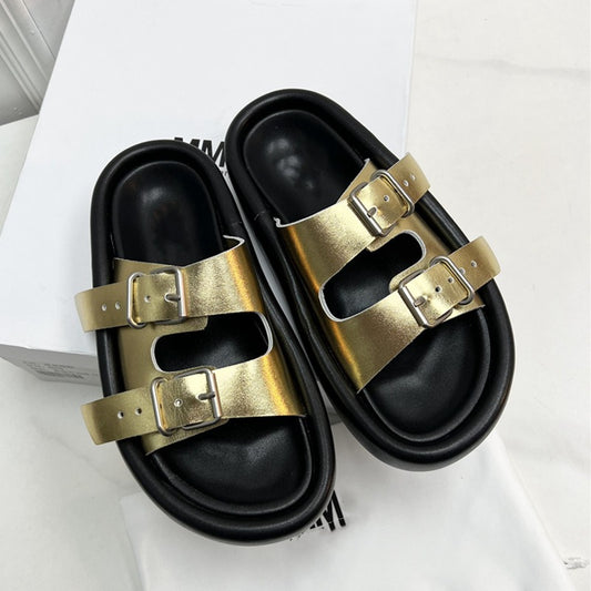 Summer casual soft sole comfortable slippers thick sole solid leather double breasted open toe outdoor versatile flat shoes